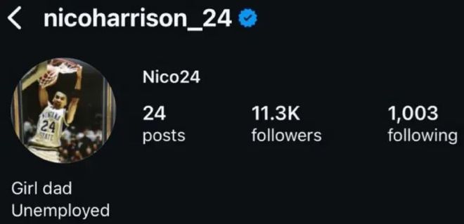 被解雇后,哈里森直接在网络上卖惨,将个人Instagram简介改为:“女儿的父亲、失业者”