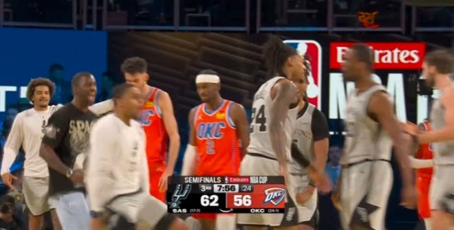 卡鲁索空篮不中,瓦塞尔造卡鲁索犯规两罚一中,文班亚马拼抢篮板造成亚历山大犯规两罚全中扩大4分优势。杰伦与文班亚马接连打铁,霍姆格伦造文班亚马犯规两罚全中,文班亚马被犯规两罚一中维持3分优势。亚历山大一条龙暴扣,卡斯尔被犯规两罚全中,雷霆连续两次请求暂停。福克斯战术犯规送霍姆格伦两罚一中,文班亚马被犯规两罚一中扩大3分优势,福克斯继续战术犯规送杰伦两罚全中。双方继续战术犯规,瓦塞尔两罚全中,杰伦故意两罚一中,卡鲁索补篮不中,最终马刺111-109逆转终结雷霆16连胜,马刺首次晋级NBA杯决赛将战尼克斯。