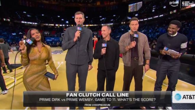 诺维茨基、纳什与格里芬等强大阵容解说,诺维茨基被问到和文班亚马1V1比赛谁能赢表示:“他会11-3赢我,他能封盖我的金鸡独立后仰。”